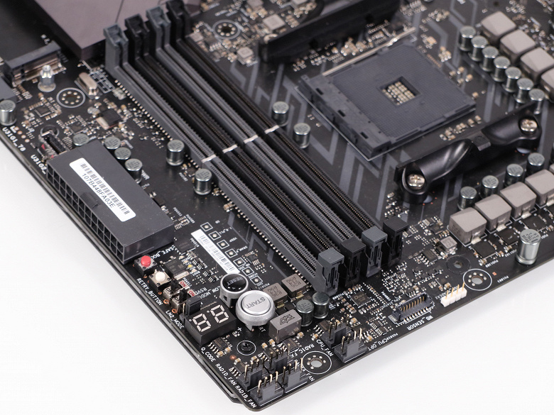 Как и вообще большинство плат уровнем выше среднего, эти модели имеют 24-контактный и 8-контактный разъемы для подключения блока питания. Кроме того, на плате есть дополнительный 4-контактный разъем питания, который может пригодиться любителям разгона. По крайней мере, он окажет чисто психологическую помощь, потому что аппетиты процессоров Ryzen (даже старших моделей) относительно скромны.