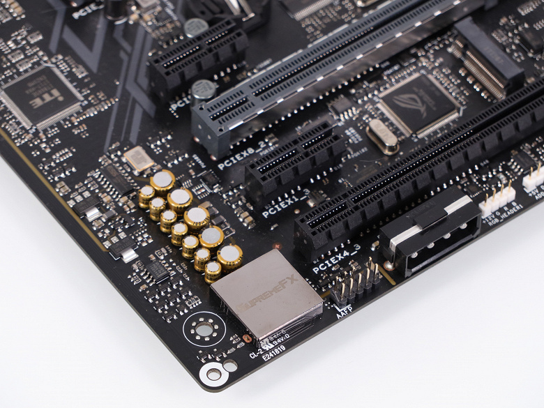 Аудиоподсистема платы (как и всех топовых моделей Asus последней пары лет выпуска), основана на HDA-аудиокодеке Realtek ALC1220, а называет ее компания, как и ранее, SupremeFX (для красоты). Все элементы аудиотракта изолированы на уровне слоев PCB от прочих компонентов платы и выделены в отдельную зону. Помимо аудиокодека аудиоподсистема платы включает фильтрующие конденсаторы Nichicon, а также отдельный ЦАП Sabre ESS ES9023P и операционный усилитель Texas Instruments RC4850 для фронтальных аудиоразъемов (читай — для подключения наушников).